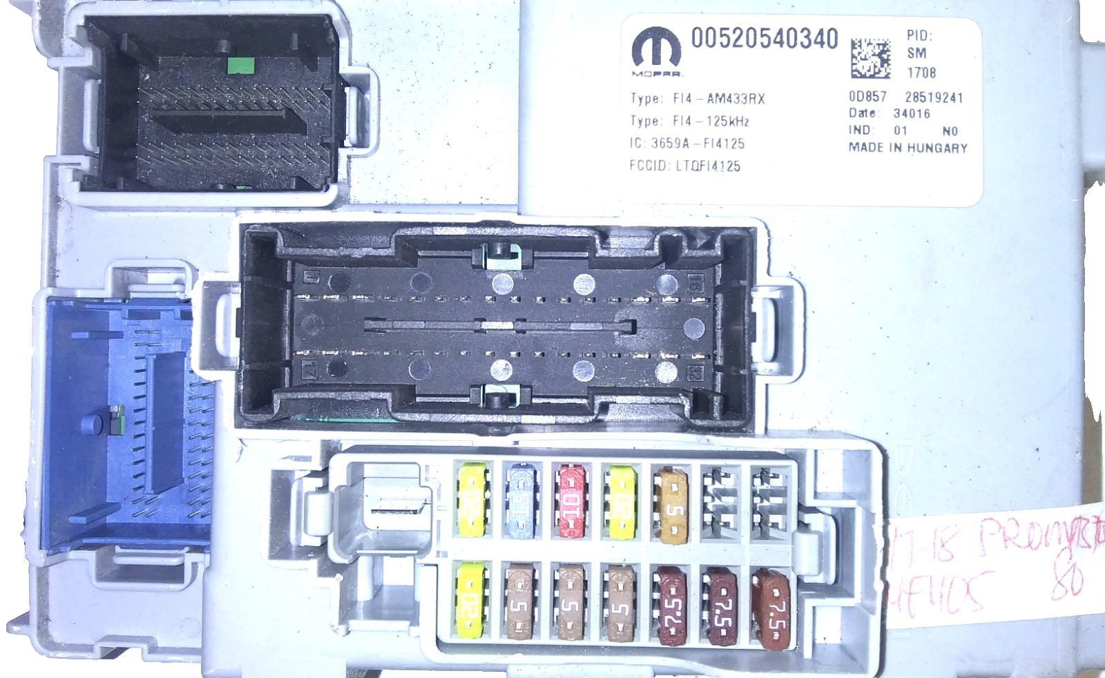 This is a good bcm or body control module for a 2017-2018 Dodge Promaster. The part # is 00520540340. It comes with a 90-day warranty. Make sure your part number matches before ordering. May need to be reprogrammed to your vehicle.