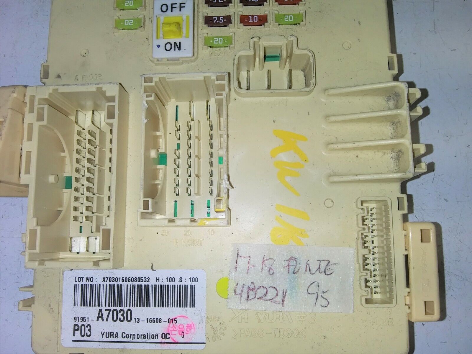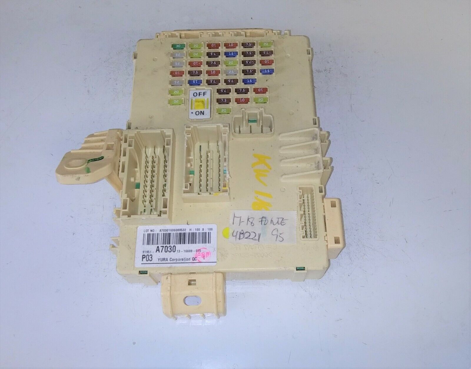 This is a good fuse or junction box for a 2017-2018 Kia Forte.  The part number is 91951-A7030. It comes with a 90 day warranty. Make sure your part number matches before ordering. May need to be reprogrammed to your vehicle.